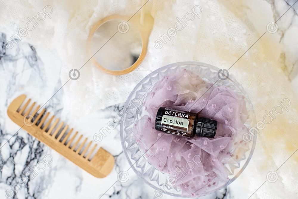 dōTERRA Copaiba with comb and mirror on marble counter