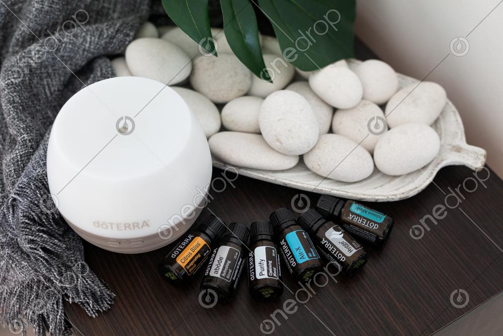 Cozy blends on table - Abode, Citrus Bliss®, Air-X, Purify and Island Mint for diffusing at home