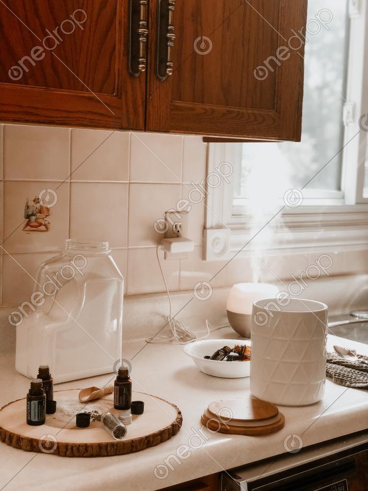 Supplies and bottles on a counter to make roller bottles and bath salts.
