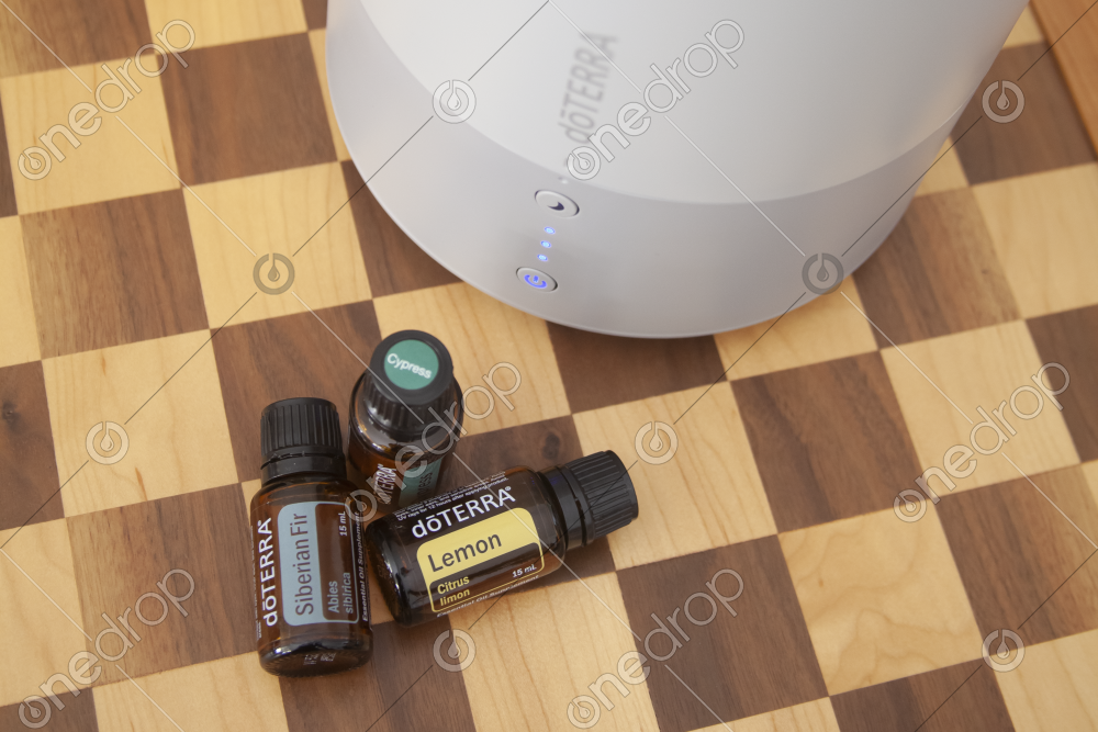 High resolution image of the Dawn Diffuser with Siberian Fir, Cypress & Lemon on a checkered wooden table. This image can be cropped to use on social media, in team newsletters, blogs, etc Please make sure to watermark with your logo to protect my work and direct your sharers back to One Drop to download their own 😀