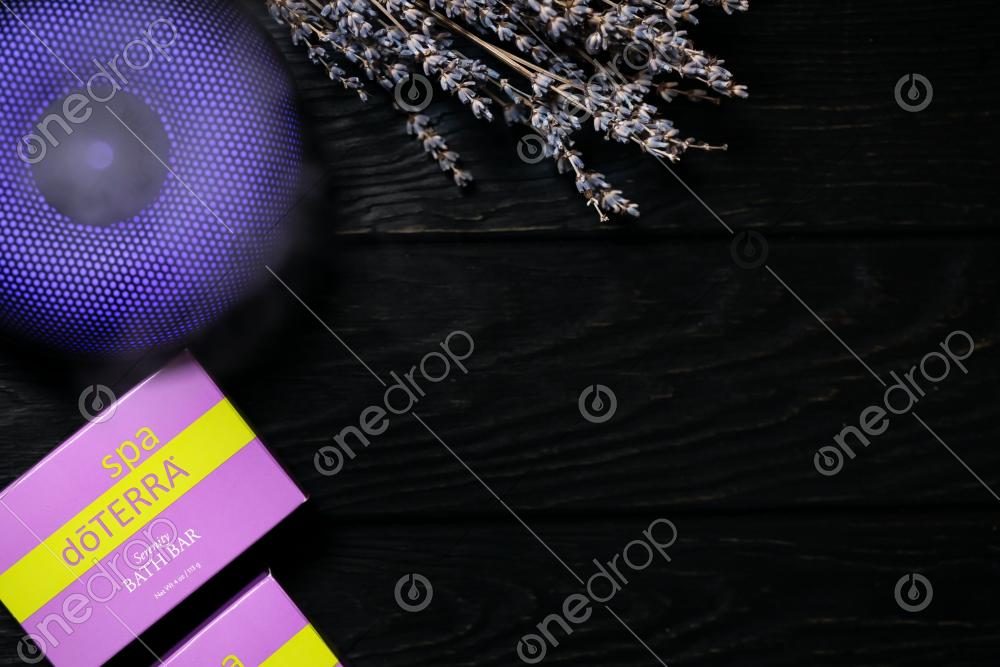 Diffuser and dōTERRA Serenity Bath Bars flat layout on wooden table