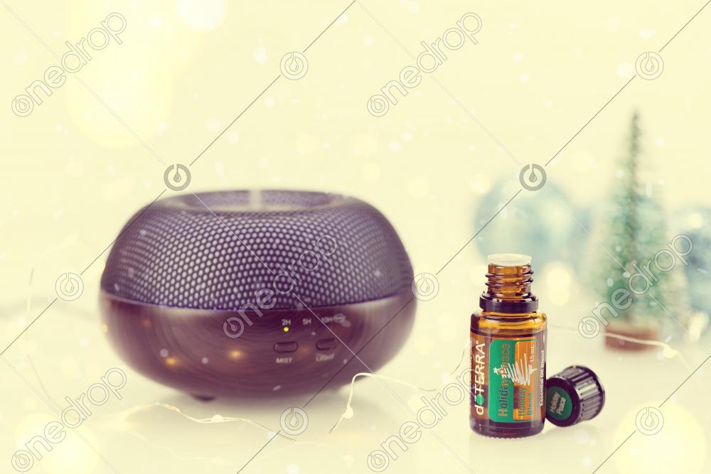 Diffuser Brevi on table with essential blend Holiday Peace, with decorations and snow. Toned image