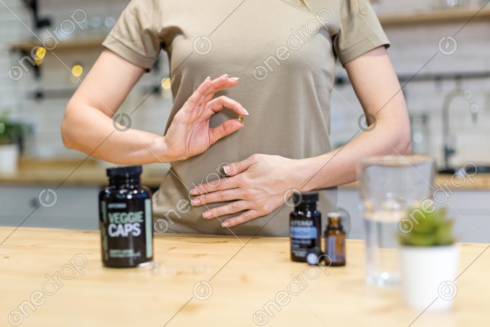 DigestZen digestive softgel capsule in female hand for internal use, bottle with essential blend DigestZen and veggie caps on blurred background, kitchen interior