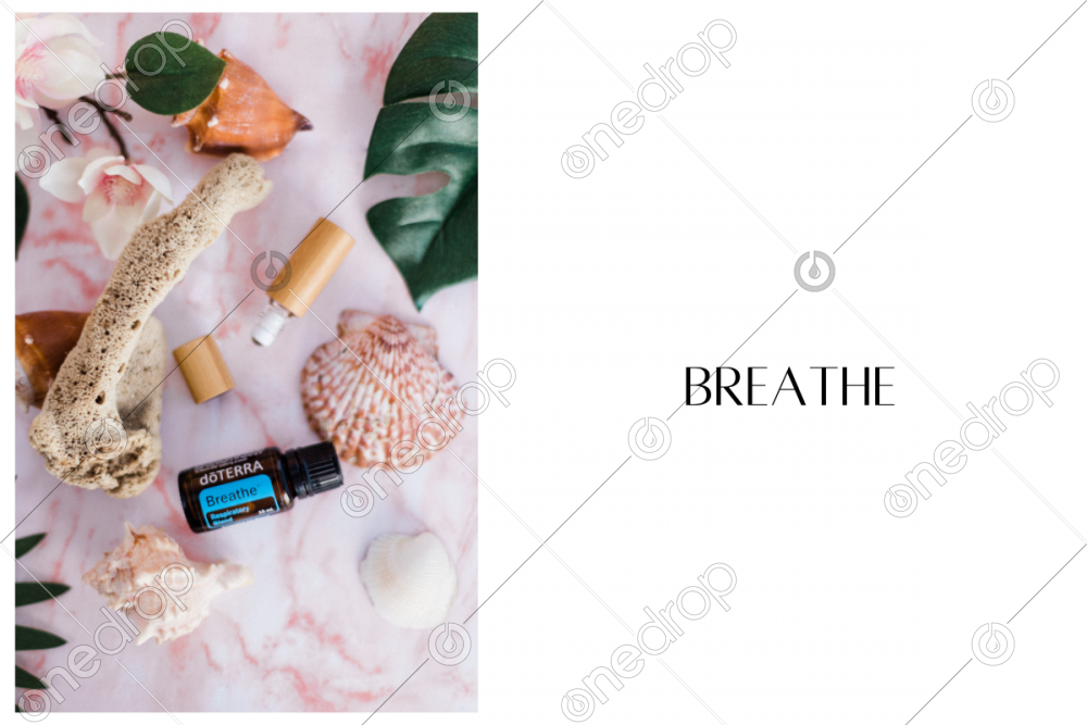 Flat lay, Breathe bottle surrounded by seashells and tropical greenery/plants with a pink/peach color palette.