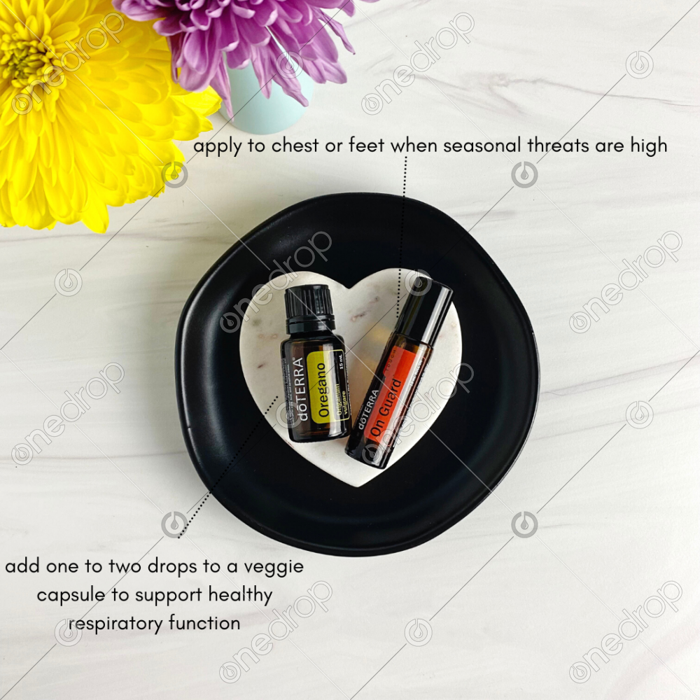 dōTERRA Oregano + dōTERRA On Guard (flat lay) with benefits