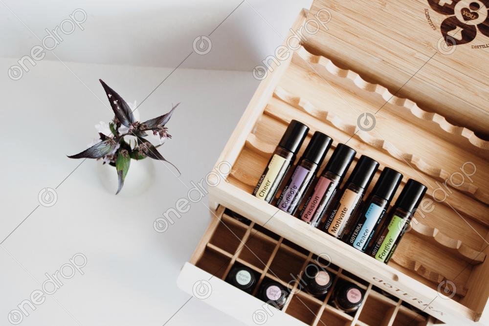 Image of the Emotional Aromatherapy Touch range in a bamboo storage box next to flowers.