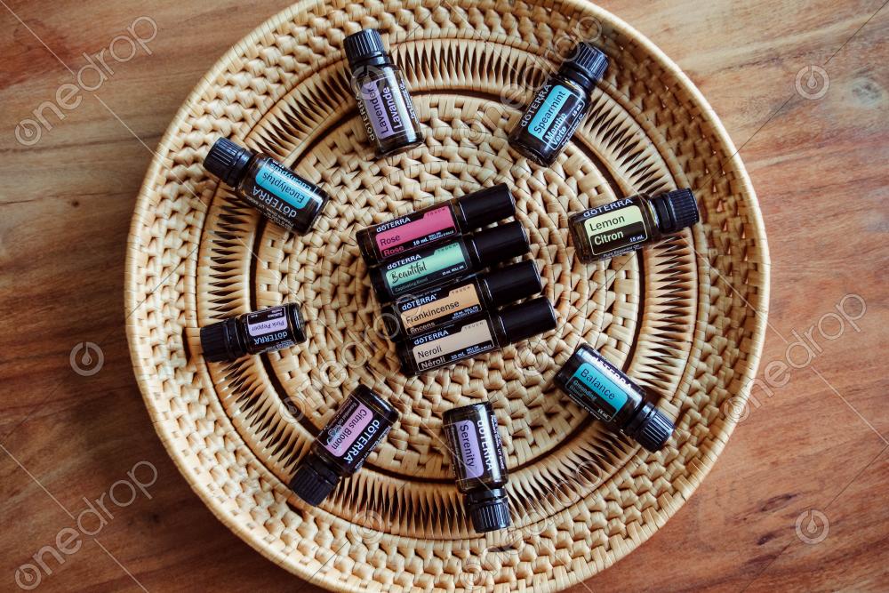 A flay lay image of a dōTERRA essential oil collection. Share this image on your social media platforms and customer education groups to celebrate everyone's oil collections! Have your customers post a photo of their collection on your post and encourage each other to learn about the versatility of their oil collections.