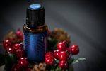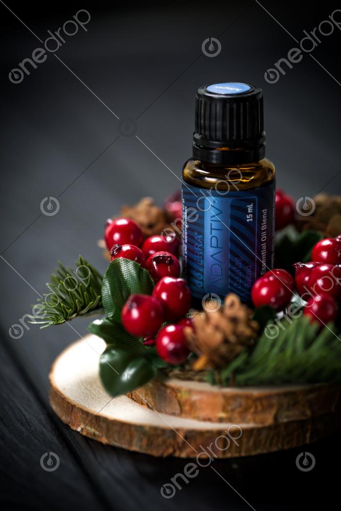 Essential oil bottle with calming blend Adaptiv on wooden background with Christmas decoration