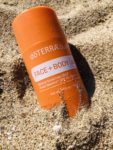 A display of the Face and Body mineral sunscreen stick surrounded by sand.