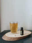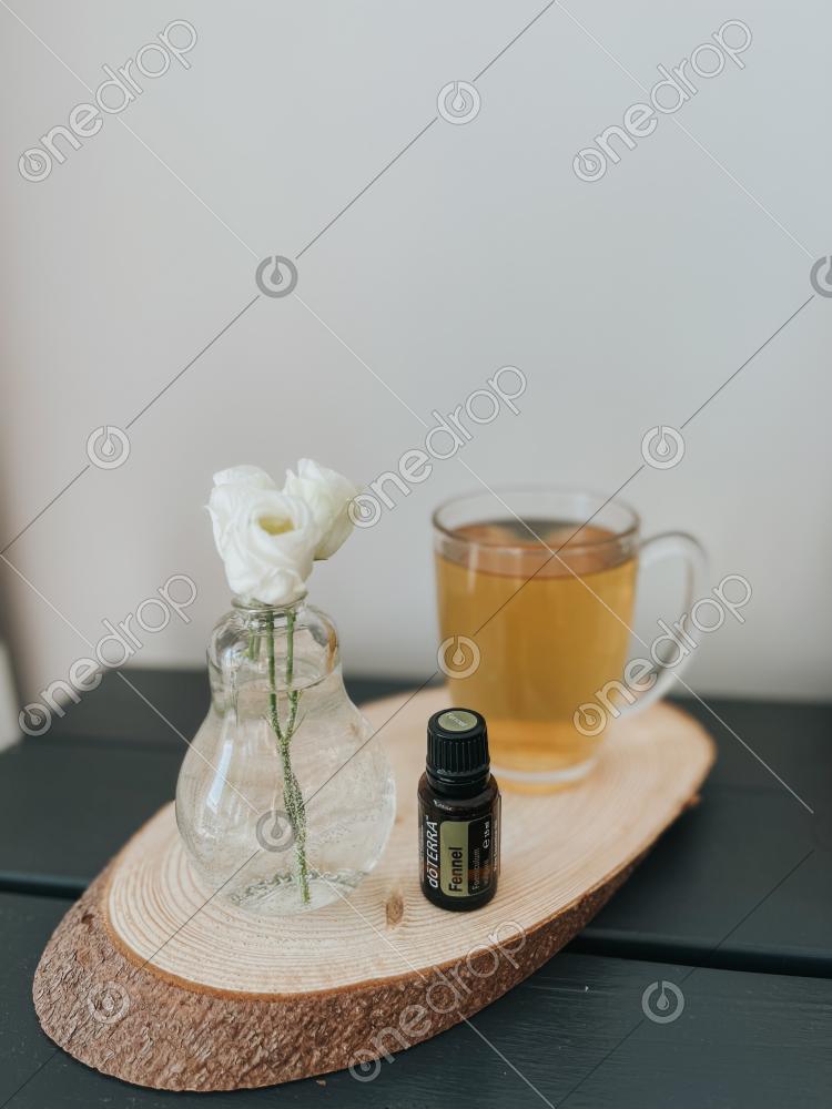 A display of Fennel essential oil with a cup of Fennel tea beside it.