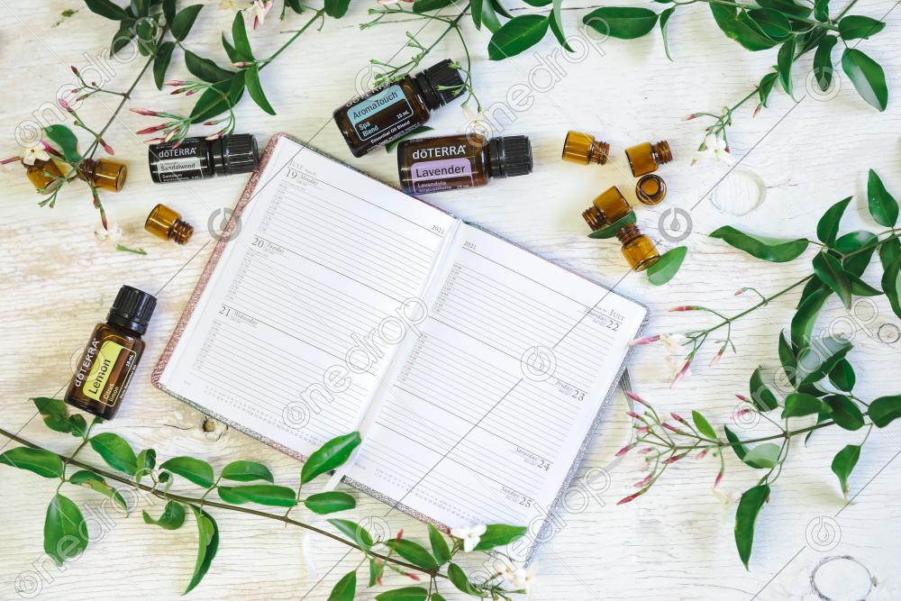 Flat lay image featuring open diary surrounded by various oils with sample drams and fresh flowers