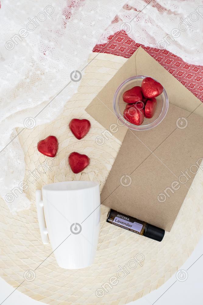 Flatlay with Lavender touch, a mug, a card, and heart shaped chocolates.