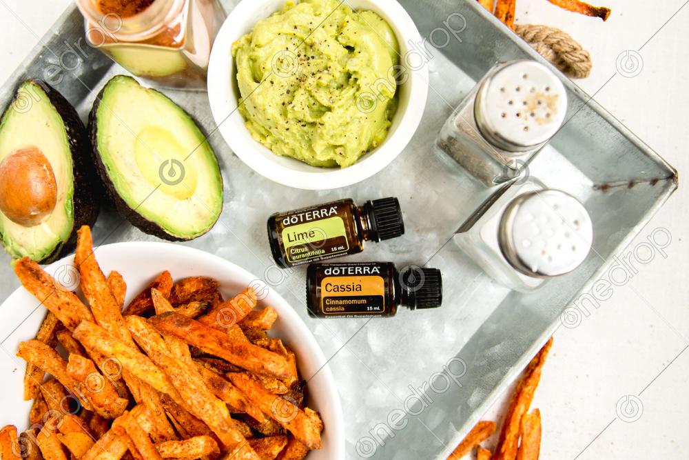 Lifestyle high-resolution photograph of healthy guacamole dip and sweet potato fries. Can be used with any recipe. Easy snack. Highlighting Cassia and Lime individual oils. Image can be cropped to your liking. Can represent any guacamole and sweet potato recipe with cassia and lime in the ingredients.