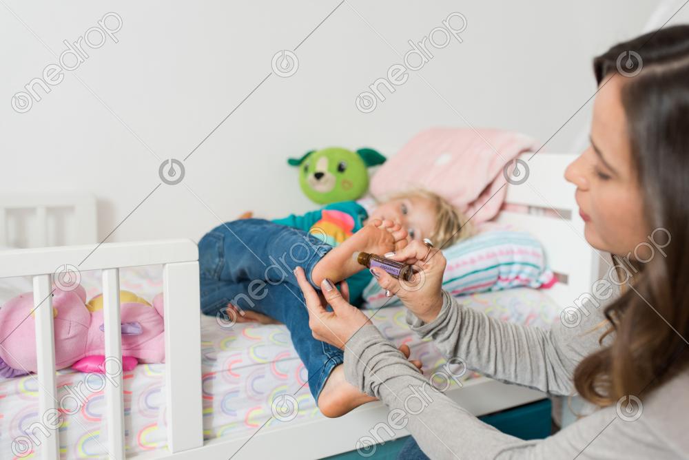 Applying oil to child's feet
