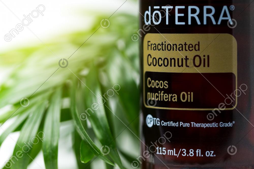 Crop of bottle Fractionated Coconut Oil on palm tree leaf background