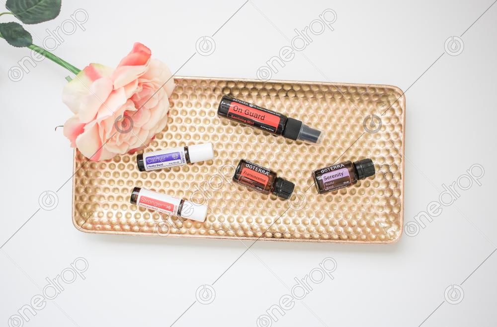 A high resolution image of a group of doTERRA 15 ml essential oils with roller bottles from the Kid's Collection on a gold tray with a pink flower. It comes on a white background for a minimalist feel.