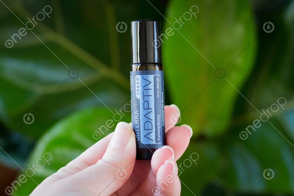 This image features a hand holding Adaptiv touch calming blend roller bottle with plant in background