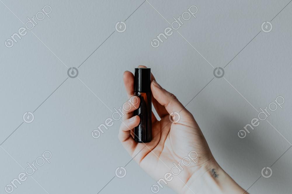 Hand holding amber roller bottle