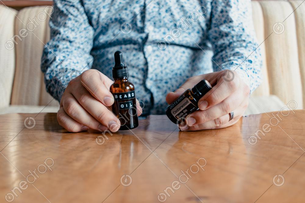 Picture of man in blue shirt holding a beard oil bottle with cedarwood essential oil bottle.