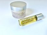 This is a bright and clean graphic showing that the Hydrating Cream and Immortelle®. This combination can be used to help with skin and anti-aging. Take a pea size of the Hydrating Cream and apply one swipe of the Immortelle® and blend it on your face. There are various graphics. One with a wood back ground, with a white back ground, and two with a plant.