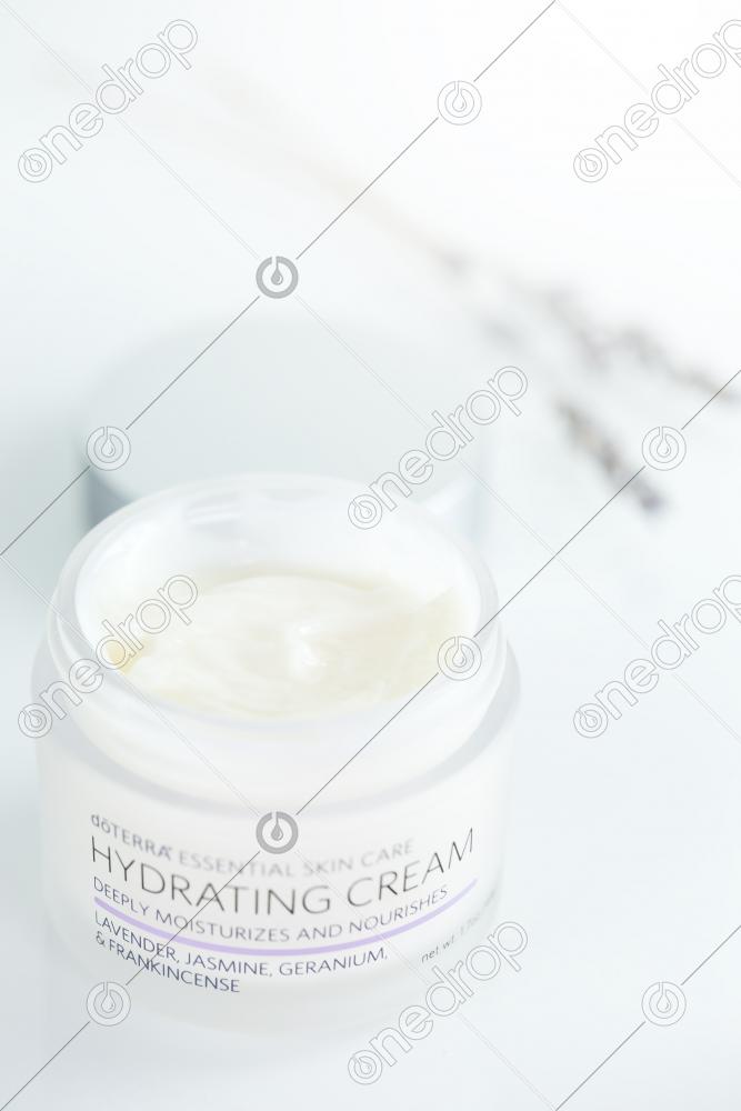 Hydrating Cream texture with open jar closeup on white background with copy space