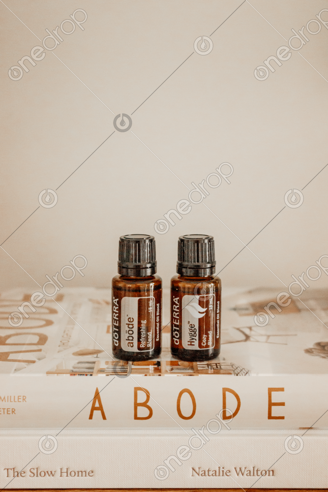 Hygge and Abode Blends standing on a stack of lifestyle books.