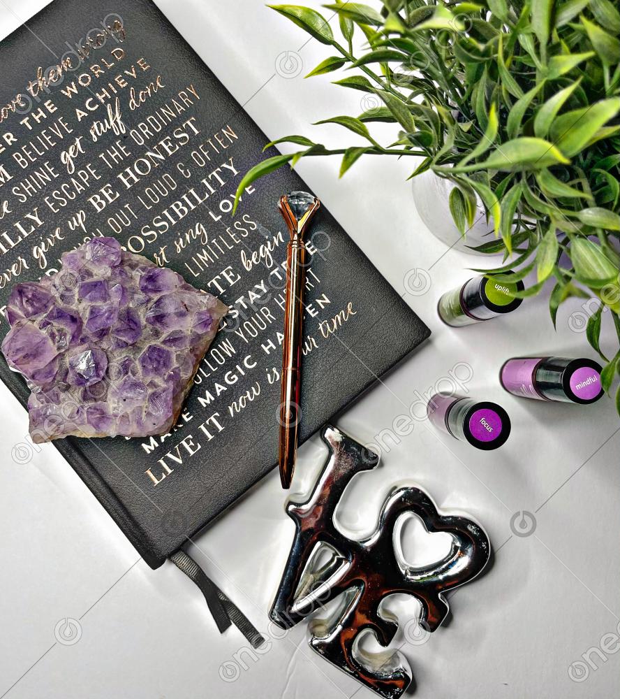 journal, amethyst crystal, essential oils diy blends, focus, uplift, mindful, greenery, flat lay, love, diamond pen