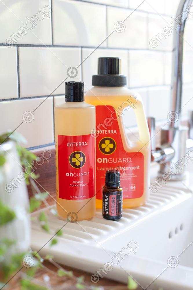 Kitchen sink image with On Guard laundry detergent, cleaner concentrate and essential oil.
