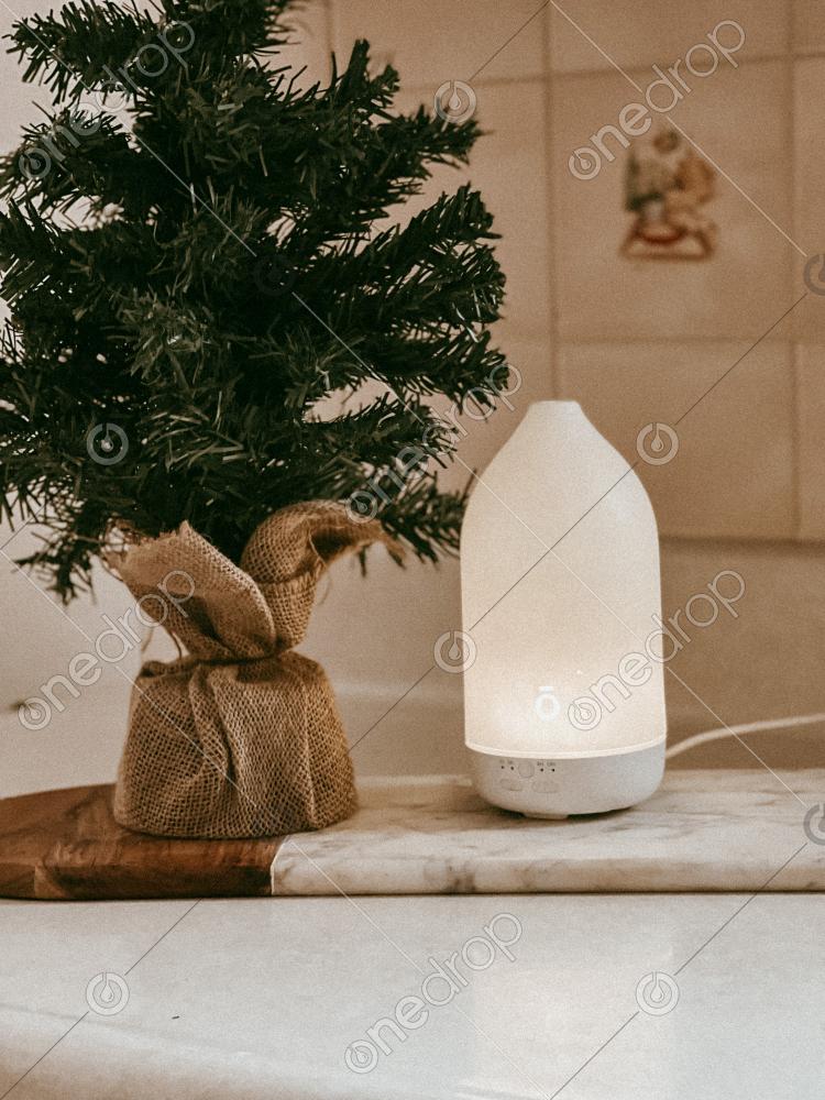 An image of the Laluz Diffuser on a counter with a tree and burlap.