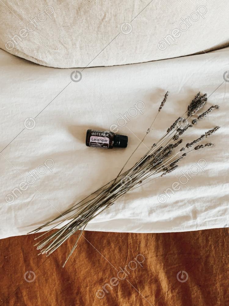 Lifestyle photo of lavender on bed linens with dried lavender flower.
