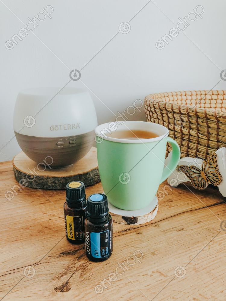 A display of Air and Lemon oils together with the Petal diffuser and a cup of freshly made tea. This combination is perfect for the moments you feel weak and need a boost of energy or you need help with your breathing in cases of nose congestion.