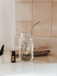 2 Images of a bottle of Lemon EO plus a glass of water and Stainless Steel Straw.