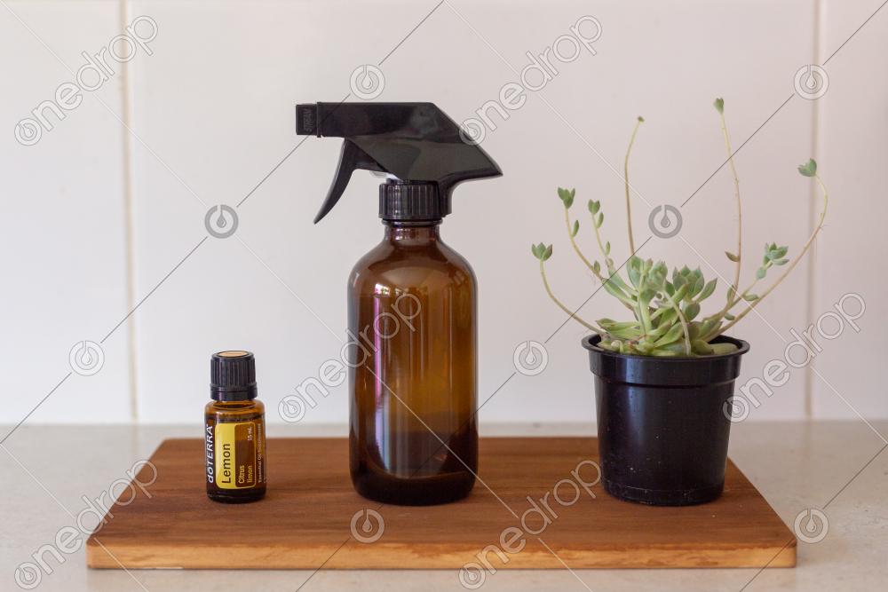 Lemon With Spray Bottle and Plant on Wood Board in Kitchen