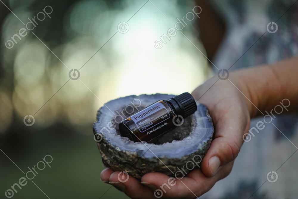 Lifestyle image of Peppermint oil sitting in crystal cupped in woman's hand. Natural outdoor setting at sunset with copy space.
