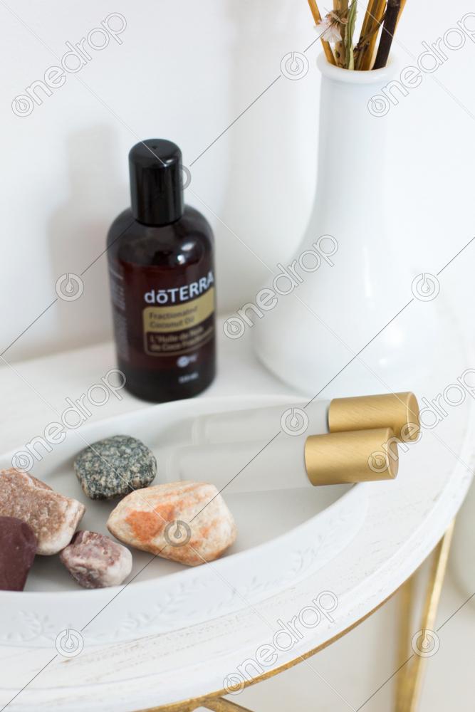 Lifestyle photo of roller bottles with fractionated coconut oil.