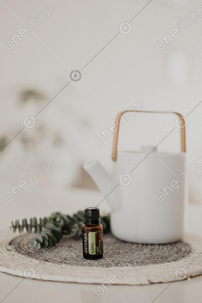 High Resolution lifestyle photo of Lime 15ml bottle with a tea pot in the background in a warm, clean home. Perfect for suggesting the use of Lime in cooking or beverages.