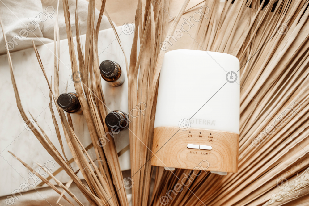 Over-head image of the Lumo Diffuser laying on a dried palm leaf with 3 oils.