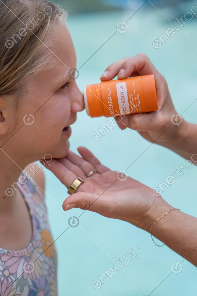 Up close photograph of a Mom applying DoTerra sunscreen stick to child's nose by the pool.