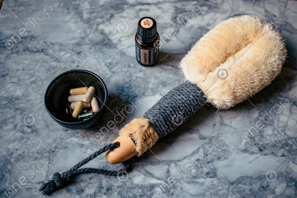 Picture of supplements, dry brush, and grapefruit essential oil on marble background