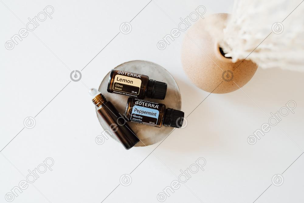 Horizontal Image of Lemon and Peppermint. Pair these oils together in a Roller Bottle with a carrier oil to help support and ease the discomfort of Motion Sickness.