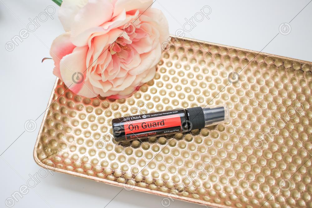 A high resolution image of a bottle of On Guard® Sanitizing Mist on a gold tray with pink flowers. It comes on a white background for a minimalist feel.