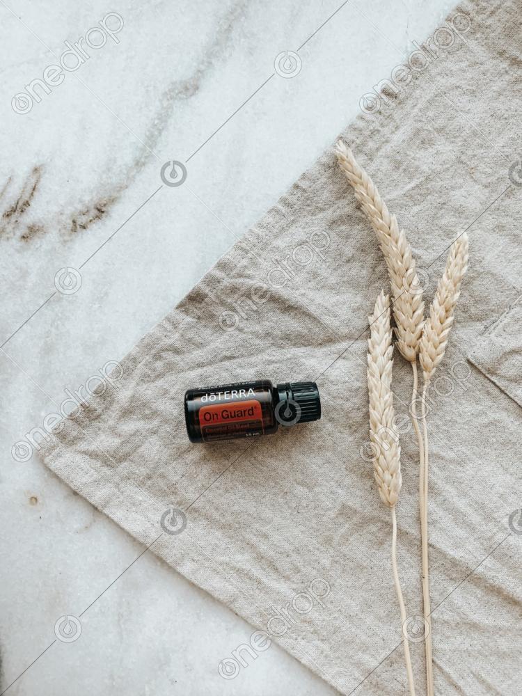 Lifestyle photo of OnGuard on linen with dried botanicals.