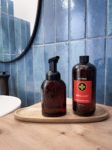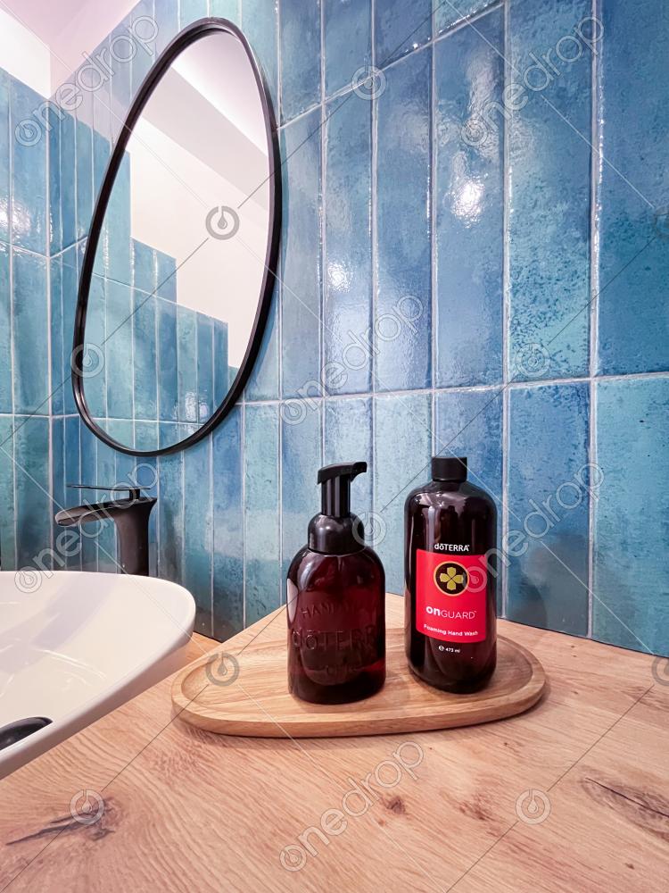 A display of the OnGuard foaming soap and dispenser on a wooden tray in a bathroom. This is the healthy alternative of the common soap in a very elegant dispenser.