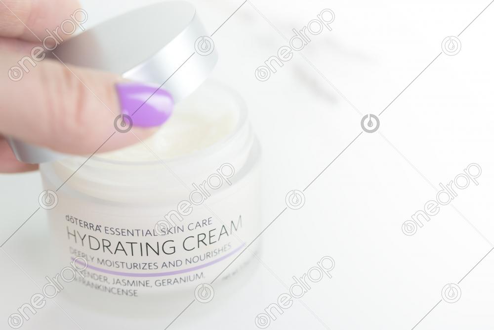 Opening jar of Hydrating Cream by female hand with lavender color manicure on white table.