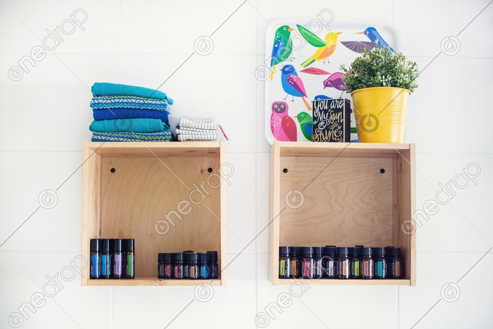 Oil bottles organized in kitchen´s shelves.