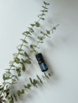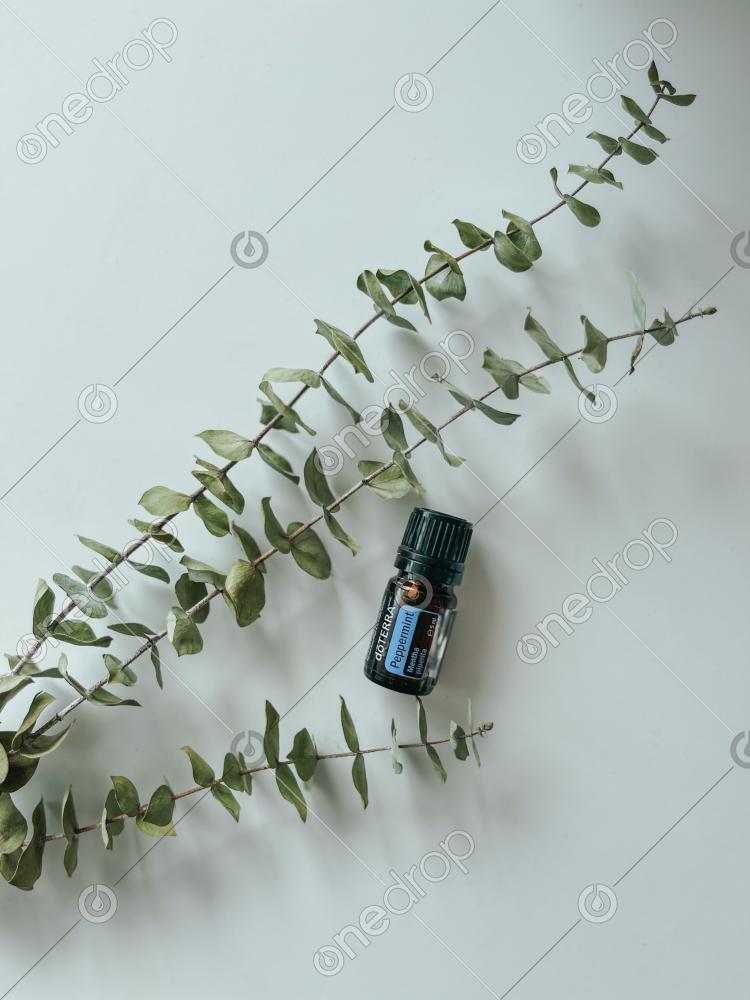 A display of the 5 ml Peppermint oil and some Eucalyptus leaves.