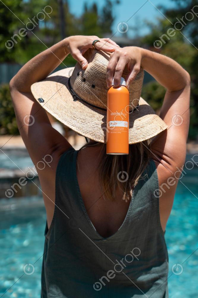 A woman poolside modeling the best sunscreen, DoTerra Body Spray Sunscreen