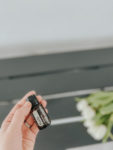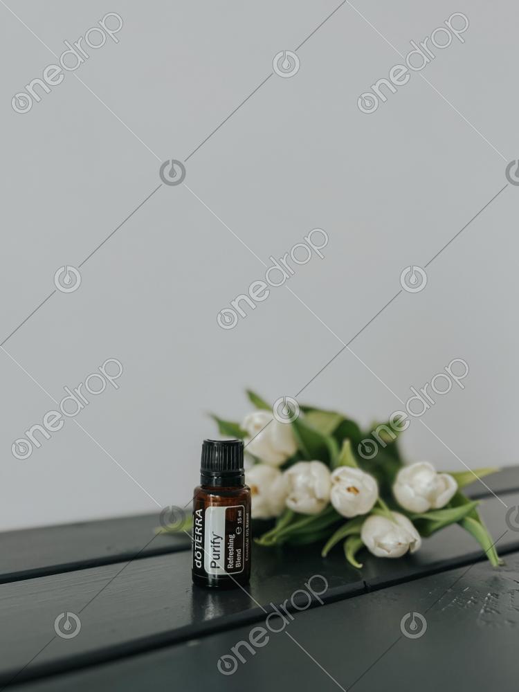 Purify essential oil with some white tulips in the background. This can be used for cleaning purposes as well as for purifying the air. There is also a shot of the Purify oil in one's hand.