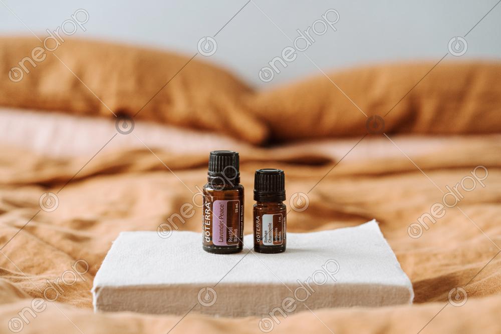 Roman Chamomile + Lavender Peace on a journal in bed.