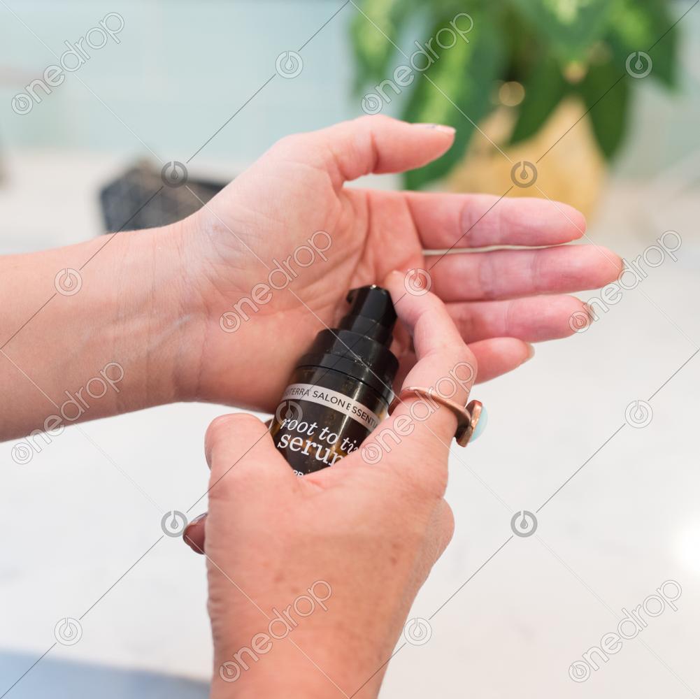 Demonstrating the bottle of how to pump root to tip serum in your hand before applying